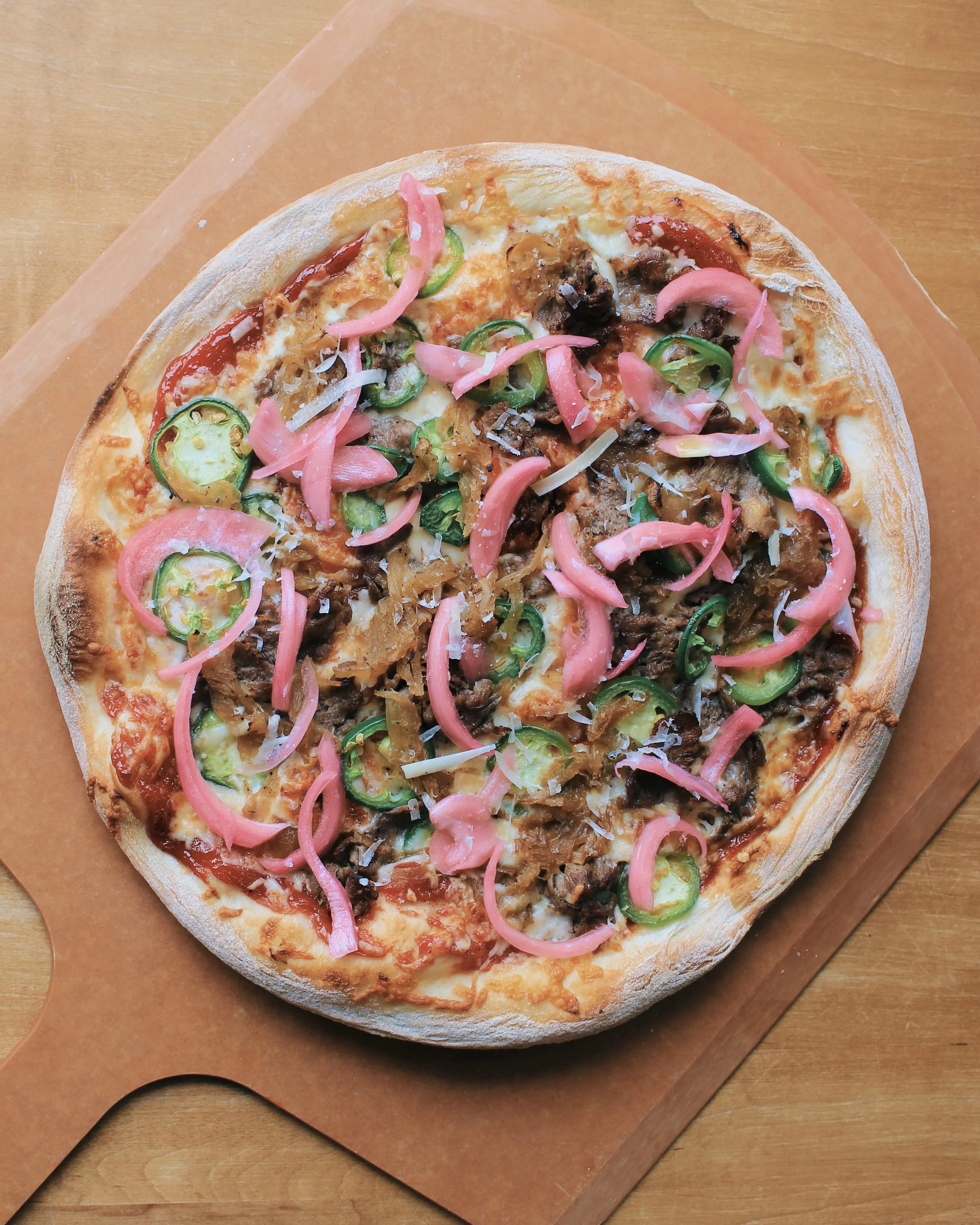 Fire up your taste buds with a slice that brings the ultimate summer cookout straight to your table. Started with a smoked chipotle BBQ base, then piled with tender shaved beef and jammy caramelized onions. A layer of smoked gouda is balanced by the sharp crunch of fresh jalapeños and pickled red onions. Finished off with dusting of Romano pecorino.