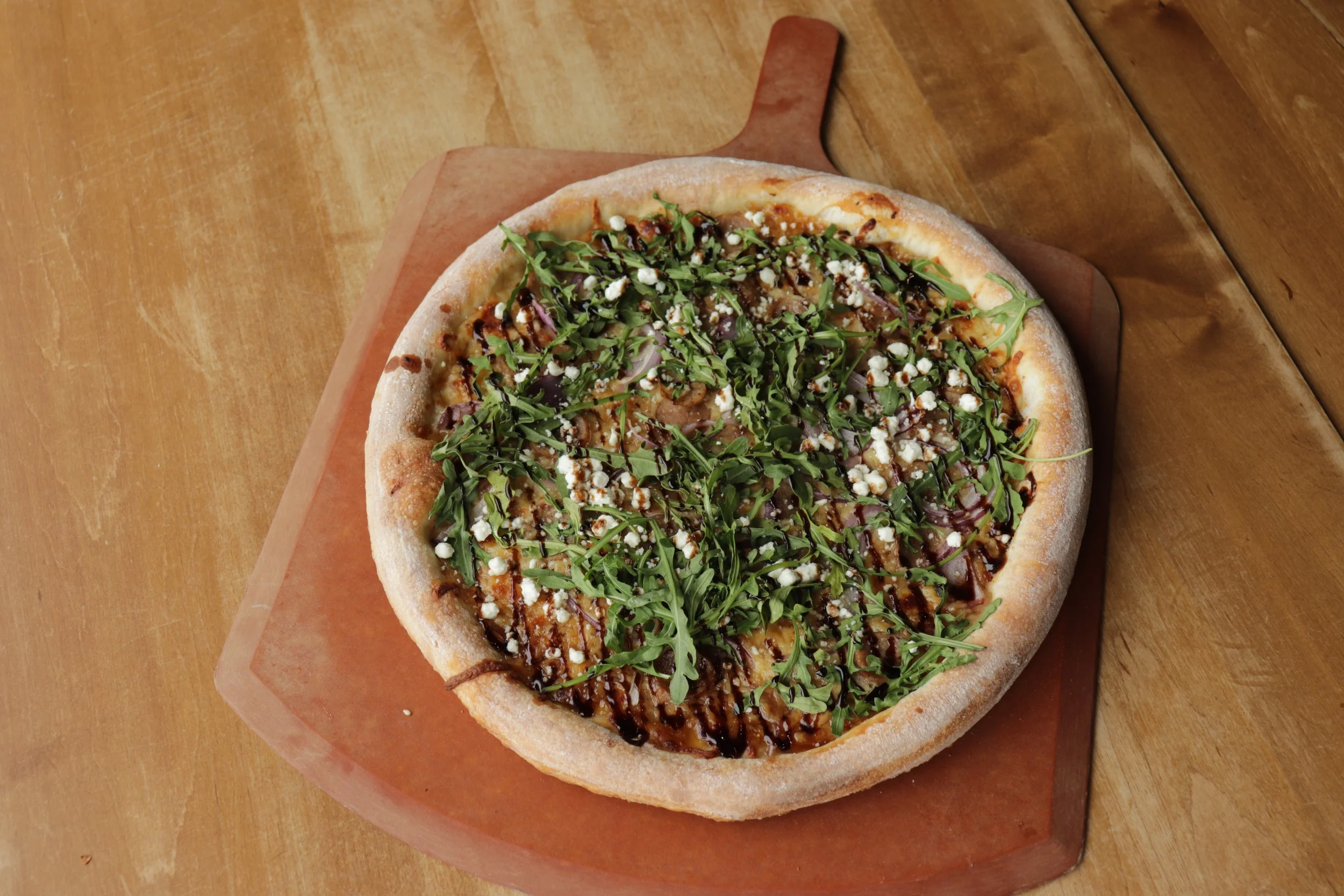Indulge in a sophisticated blend of flavors that is the perfect blend of sweet and savory. Started off with honeyed fig base topped with melted mozzarella and seasoned Italian sausage. Goat cheese added for a tangy finish, and red onions for a sharp crunch. Once out of the oven, this plate is topped off with fresh arugula and a balsamic glaze drizzle.