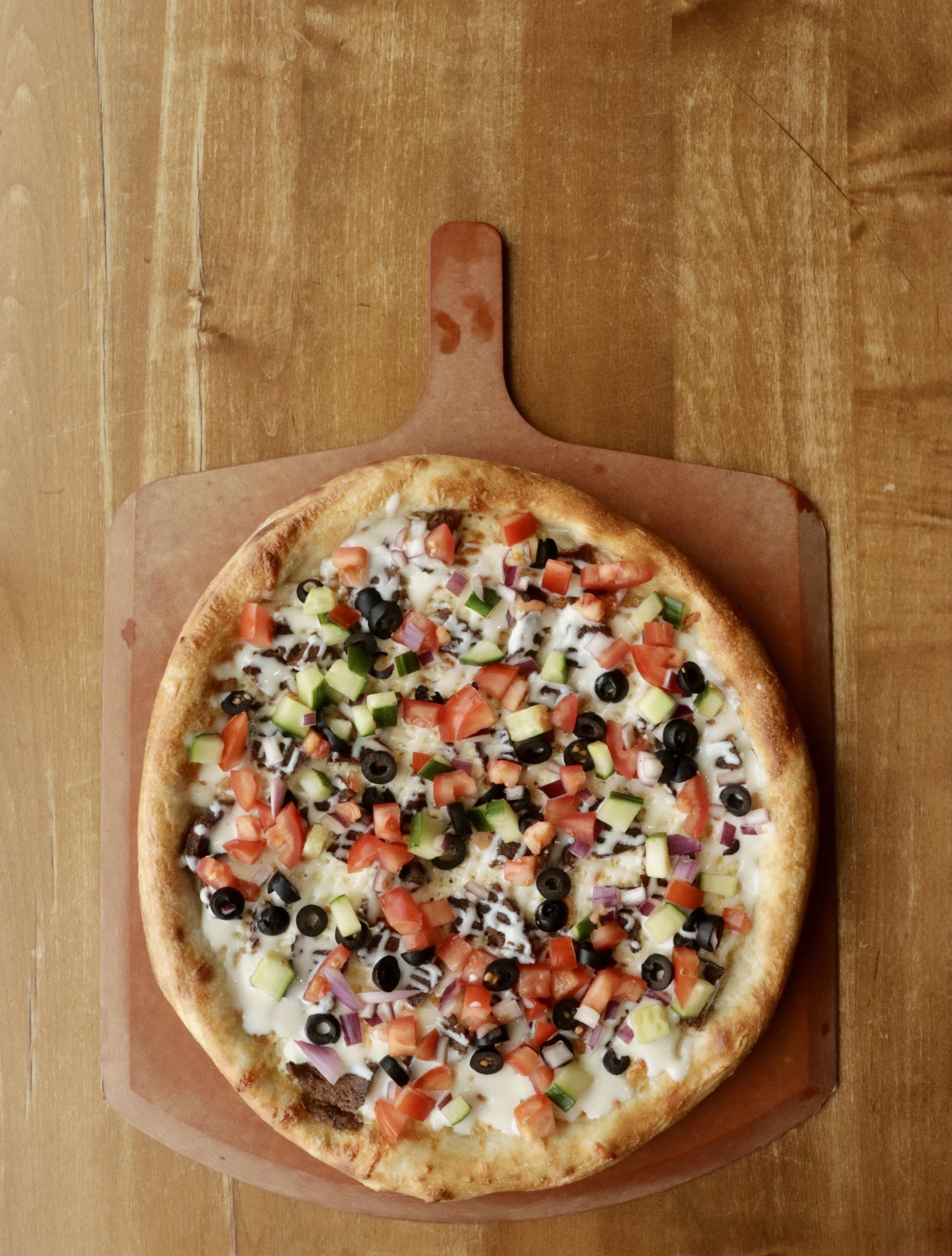 Smothered in our garlic aioli base, sprinkled with mozzarella cheese blend, layered with thin-shaved Donair meat, then topped with fresh vegetables: chopped Roma tomatoes, cucumber, red onion and black olives. Finished off with a sweet East-Coast inspired Donair sauce to capture the true Donair flavours.